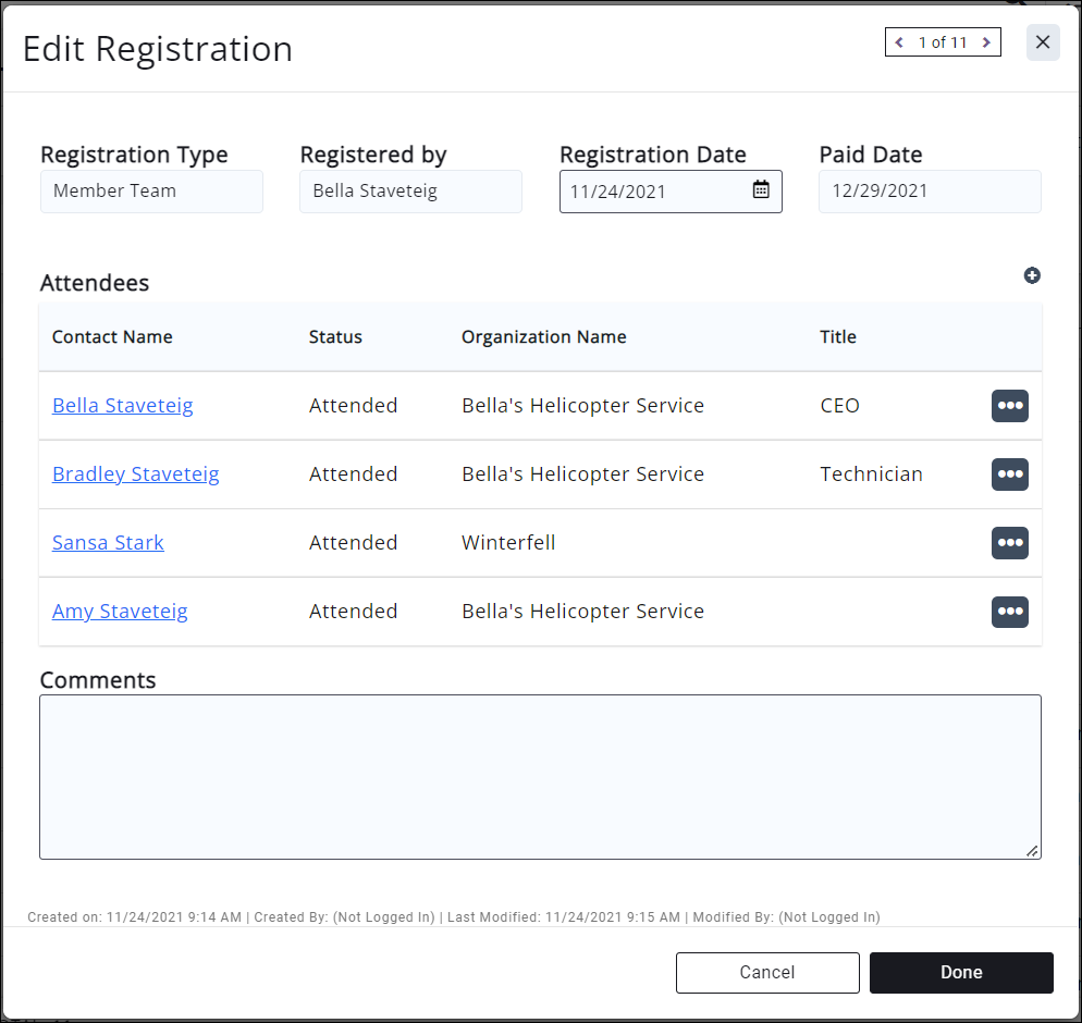 - Clicking on the Reg. Id of a registrant will give you a snap shot of the registration and an opportunity to add any comments. These comments are for internal-use only.