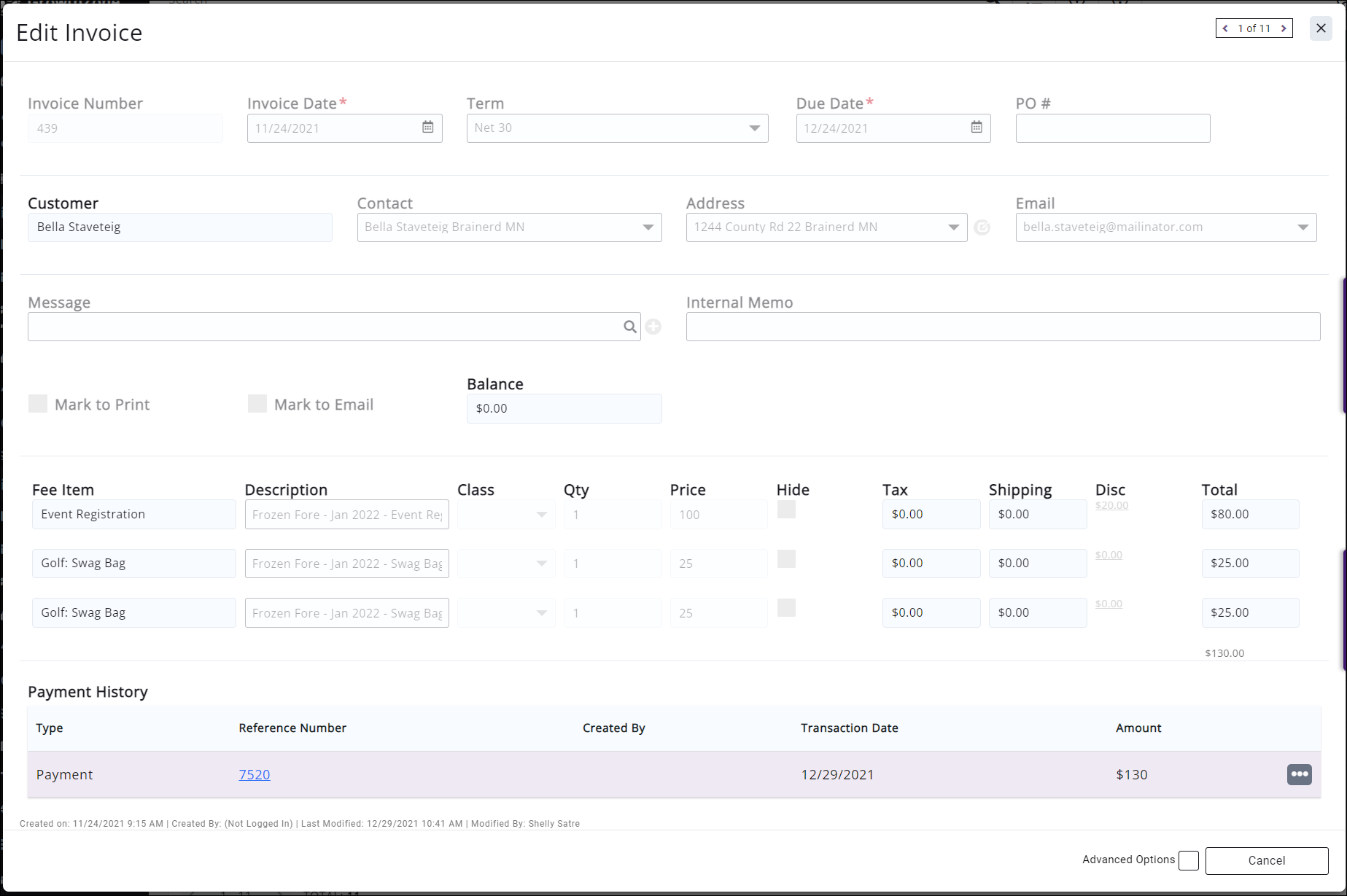 In the Edit Invoice window you can make various edits to the invoice if it is unpaid. If a payment has been made you can view the payment history by clicking on the Reference Number in the Payment History section. If no payment has been made, the Payment History section will be empty.
