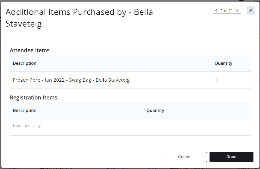 - If there are additional items available for purchase during event registration and a registrant purchases 1 or more, the number purchased will appear in this column. Clicking on the number will display the quantity of each item purchased by that registrant, organized by Attendee Items and Registration Items. Refer to Additional Items for information on the difference between these types.