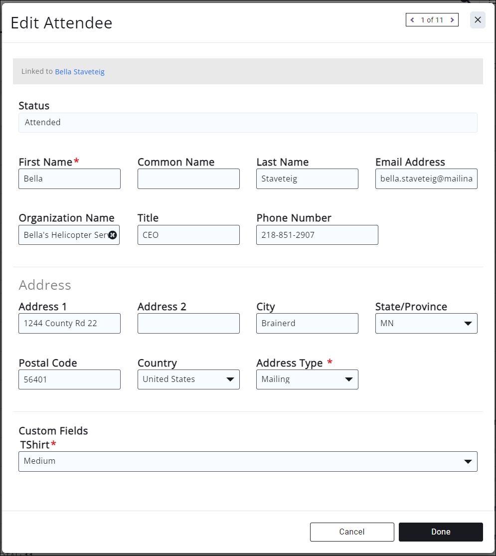 - Clicking on the Name of a registrant brings up the Edit Attendee window, allowing you to edit contact information of the attendee, (which you may need for billing or other event-related communication), as well as populate any custom fields set up for the event. This function is useful when you are selling tables of 8, and need to update the Additional Attendee(s).