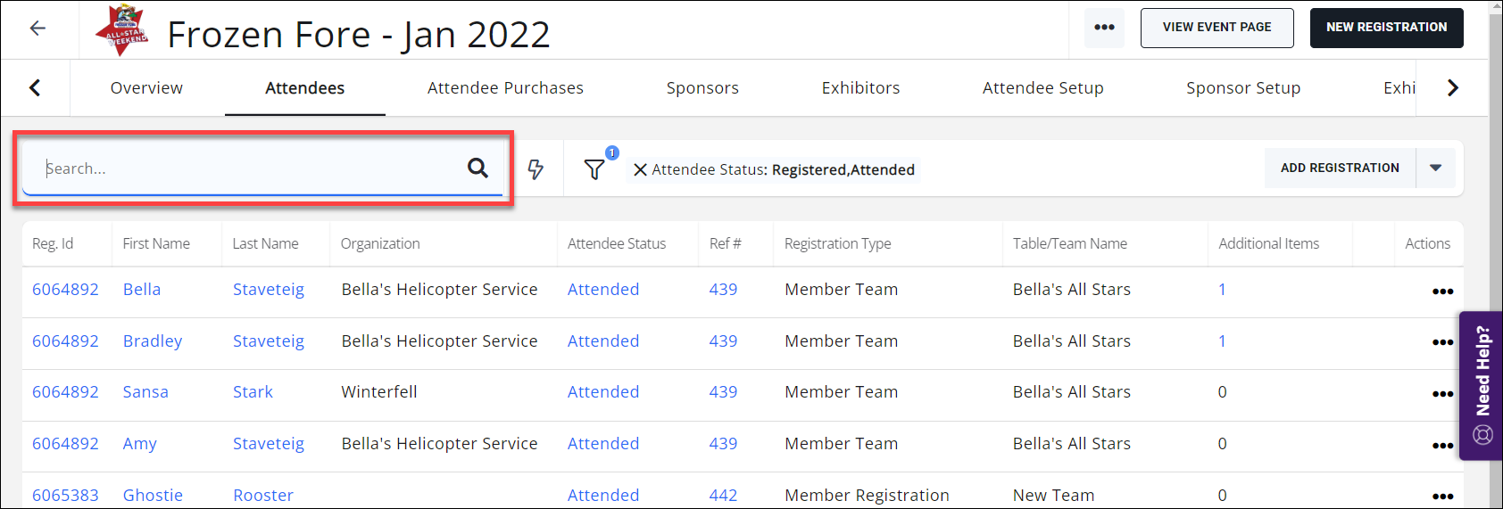 The event Attendee tab will contain important information about the attendee, including the Registration Type and documentation of any Additional Items purchased. Each column in the table is described below.