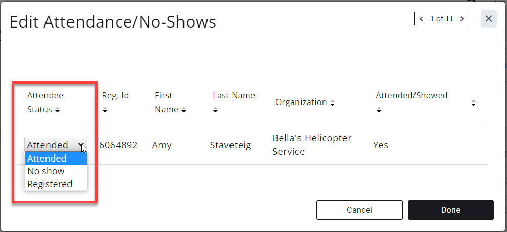 - The attendee status column displays the registrants current status related to the event. You can change an attendee's status by clicking on it and selecting the desired status from the dropdown. Options are Registered, Attended, and No Show.
