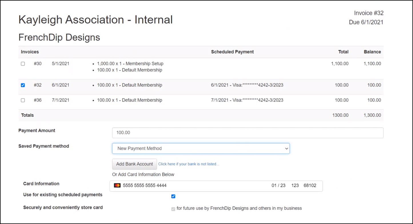 - Update the profile used for future scheduled billing. Enter card/bank information and check Use for existing scheduled payments. IMPORTANT: This will NOT update the profile associated to the advance invoice. If the member wishes to pay the advance invoice with the new profile, see #2 above.