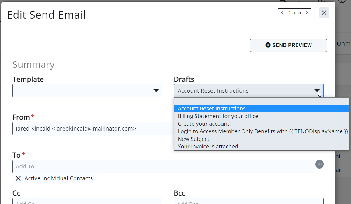 NOTE: Once a draft email is sent, it is no longer listed on the Email Drafts page, nor will it be visible in the drafts drop-down list when sending emails. It is not a template.