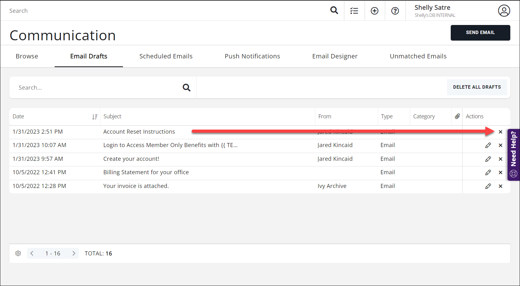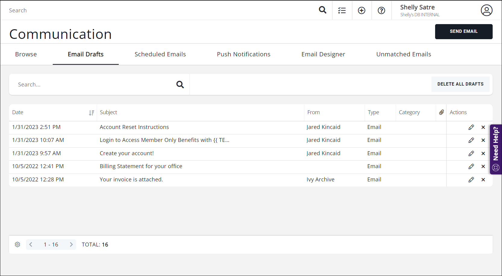 You can edit or delete the Email Draft on the Email Drafts tab. Additionally, by clicking the subject of the draft, the Send Email screen will be displayed, and you can send the email.