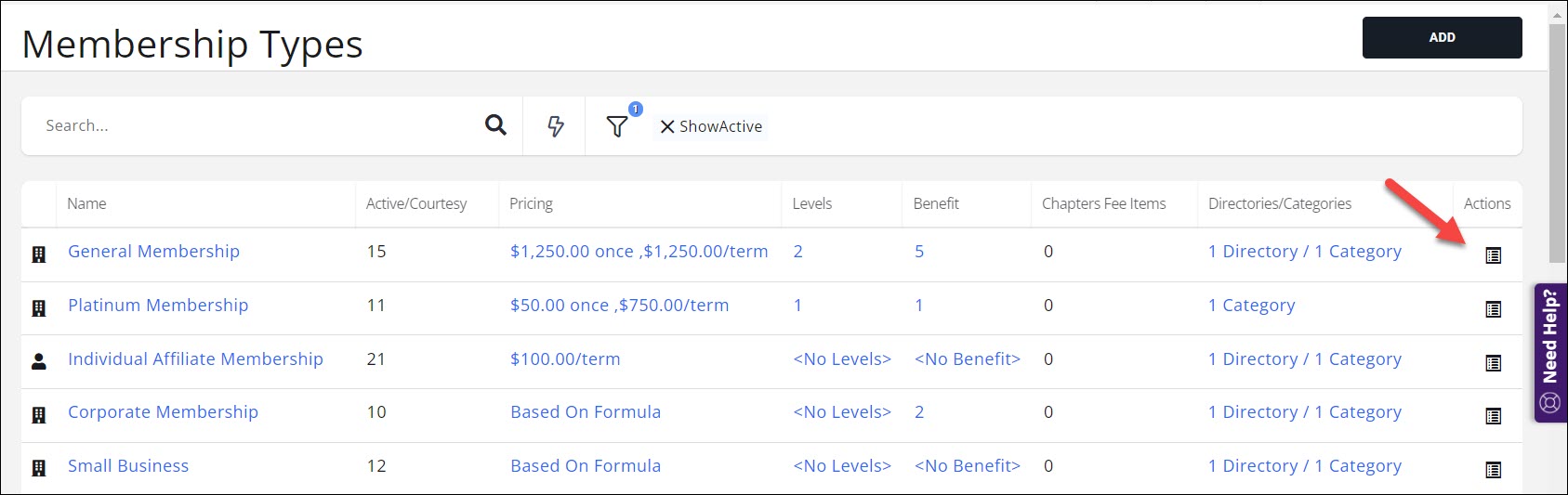 - Click Types tab in the Memberships section. A list of membership types currently setup in your system will be displayed.