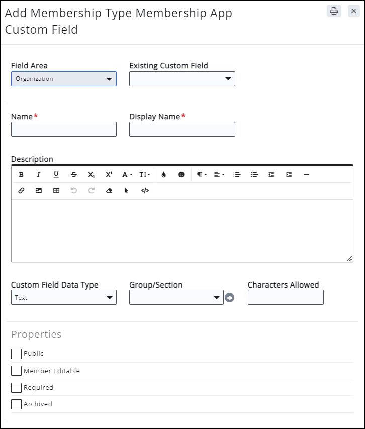 icon. Learn more about Custom Fields. NOTE: Custom fields do not need to be unique for each membership type. If you have previously created the custom field needed, simply select it from the Existing Custom Field list.