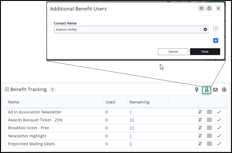 You also have the ability to select additional contacts that can use event benefits per business in addition to the primary contact. Associations with benefit users that have a lot of members may require more than the primary contact to be able to register for events and use the benefits. To select additional contacts that can use event benefits, select the person icon under Benefit Tracking to add Additional Benefit Users.