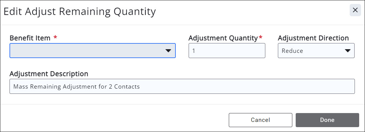 - On the Edit Remaining Benefit Items screen each item associated to this contact is displayed. Your remaining benefit items will be selected and remaining quantities displayed.