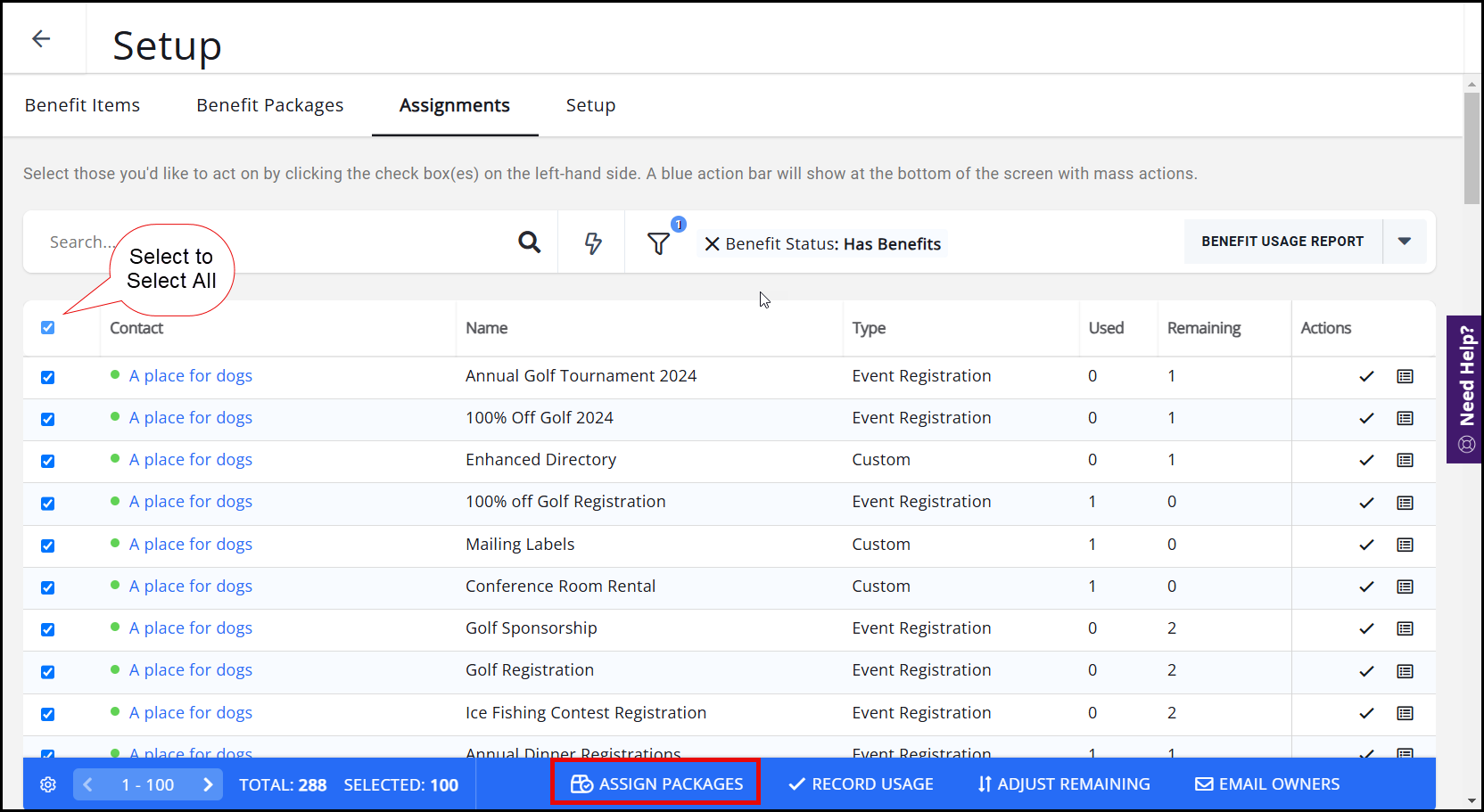 - On the Assignments tab you can filter to specific membership types (along with a variety of additional options). Once you have filtered the contacts, click Select All check box. A blue bar will appear at the bottom of the screen.
