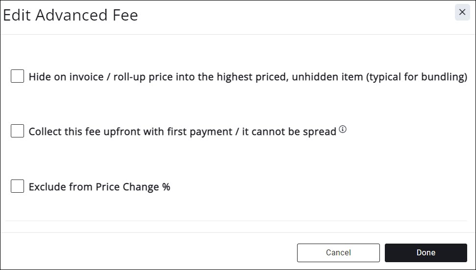 - Hide on invoice/roll-up price into the highest priced, unhidden item (typical for bundling): Select this option if you wish to hide this fee item on an invoice.