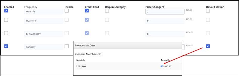 Choose which enabled frequency you prefer to have selected as the default for the pricing on the membership application.