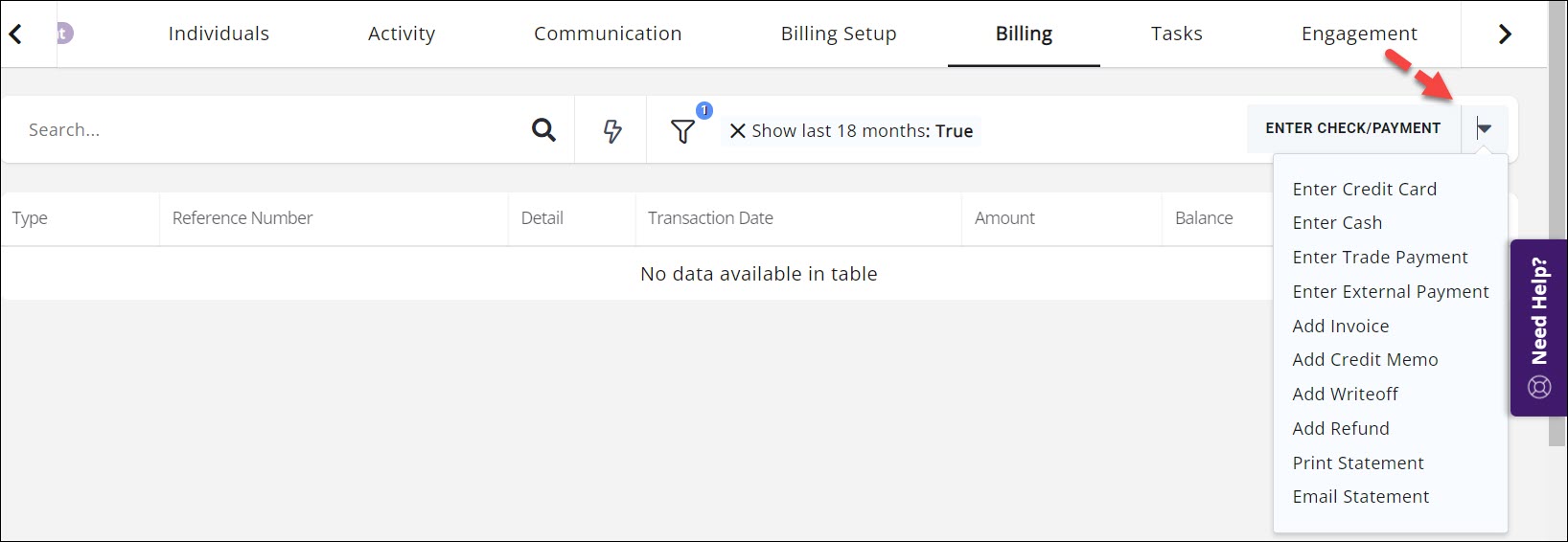- On a Contact's Billing tab, click the down arrow adjacent to Enter Check/Payment.