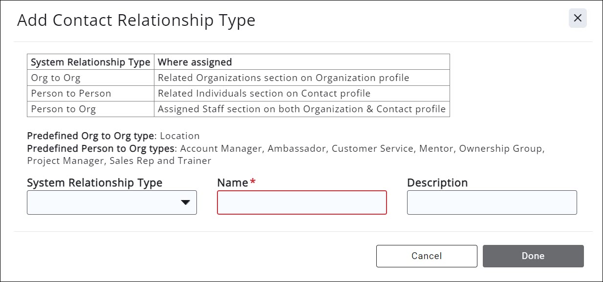 - Select the desired System Relationship Type. These relationship types drive where the contact relationship type can be assigned in the software. For example, if you are creating a relationship type for your staff to member, select Person to Org.