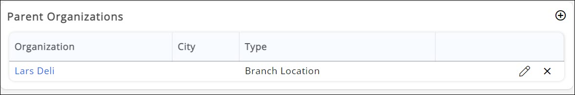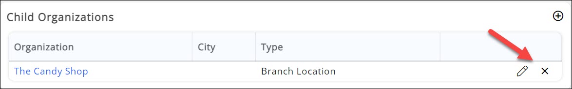 - Remove the existing relationship by clicking the X icon to the right of the relationship listed in either the Child Organizations or Parent Organizations section, whichever is appropriate.