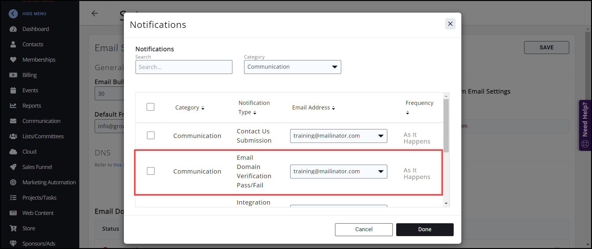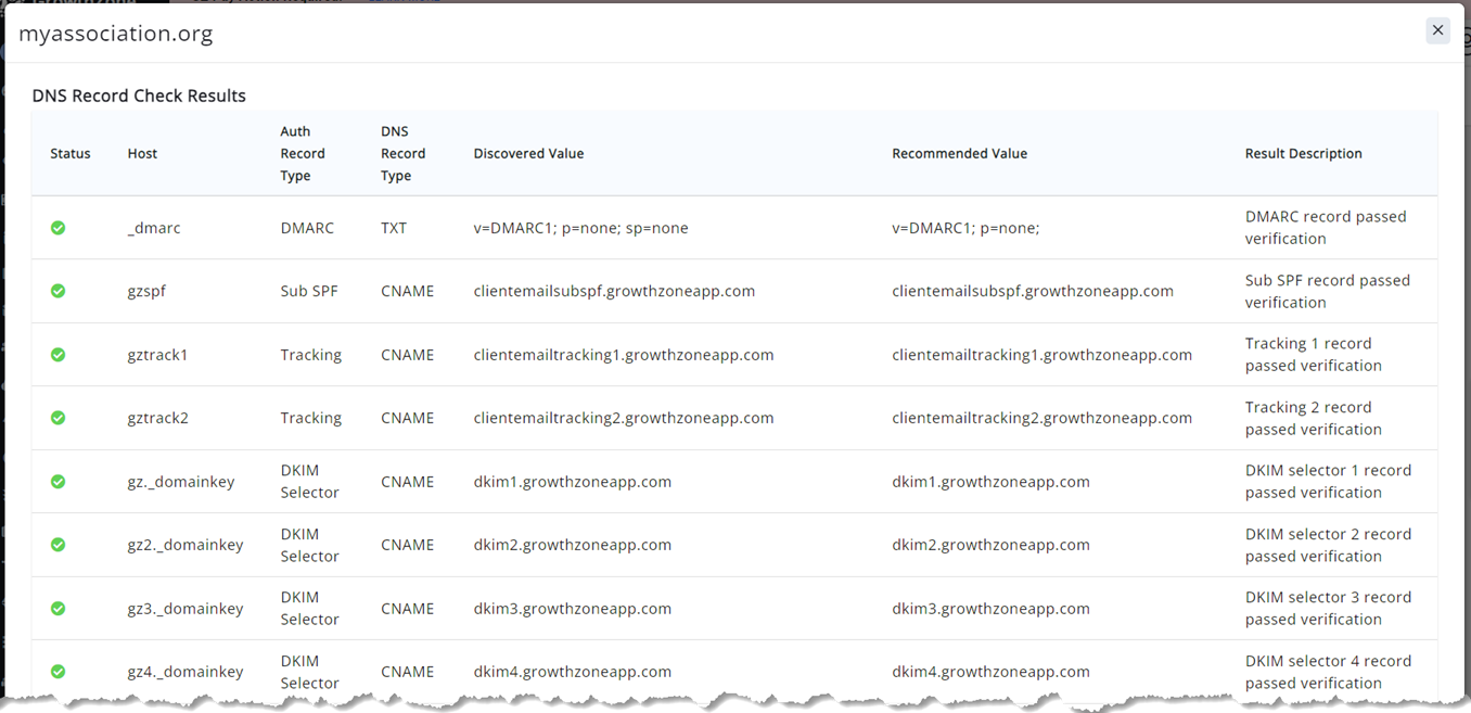 Each year, GrowthZone will run a periodic recheck of DNS settings. Staff can sign up to receive this email by subscribing to the Email Domain Verification Pass/Fail Notification Type.