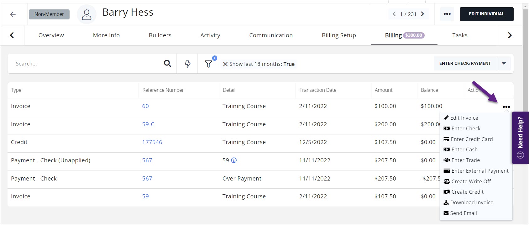 - For the desired contact, click the Billing tab.