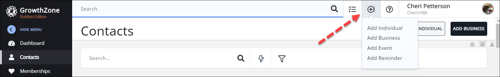 You can easily add new individual contacts to your database by clicking Quick Actions in the header bar