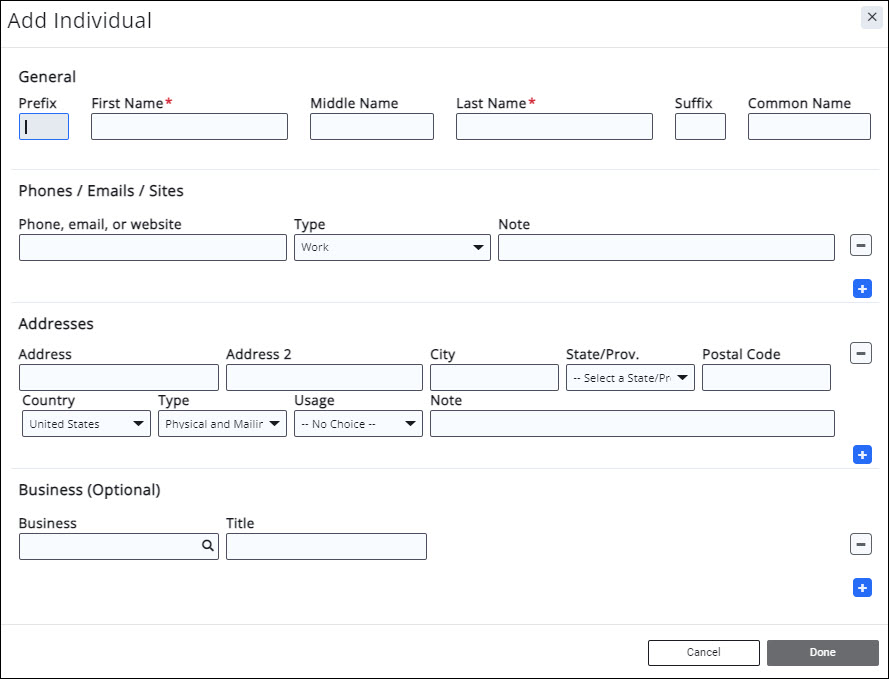 - Business – you can associate the individual to an existing organization contact, or assign a new organization.