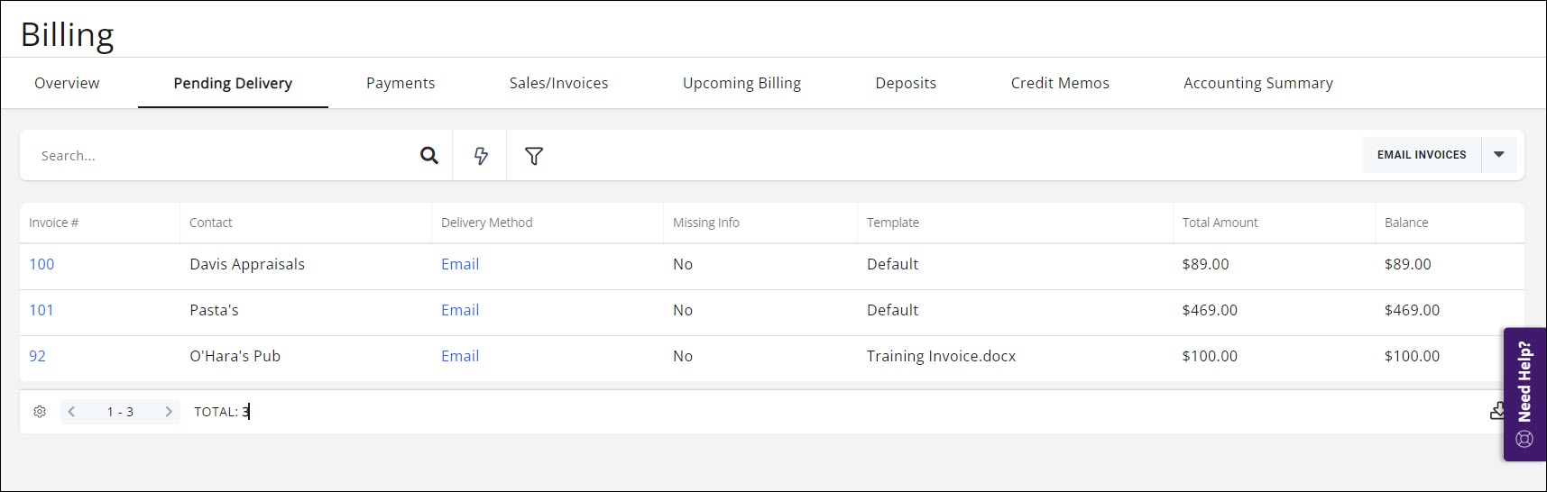 - When billing is run on the Upcoming Billing tab, all invoices with Mark to Print and/or Mark to Email enabled will display on the Pending Delivery tab.