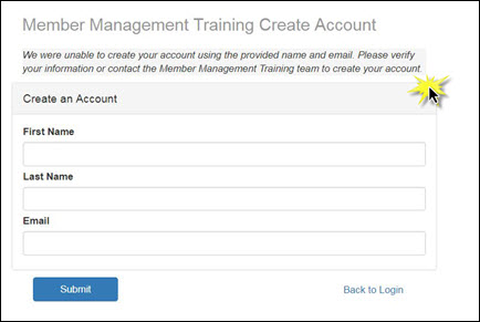 - If a match is found in the database for the email and last name, a create login email will be sent to the user. The user will receive the following notification in the browser "An activation email has been sent to you. Please check your inbox to complete your account setup. Back to Member Login". Within the email sent to the member, they will find a link to access the Create an Account screen.