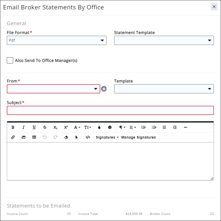 Tip: If “Also Send To Office Manager(s)" is selected, it will send an email to the default email address of the contact(s) marked with the “office manager” access level for that office. The office manager email will contain a statement only for the office that they are managing.