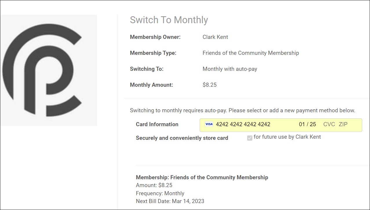- On the checkout screen, the member will be prompted to provide credit card information (or select a stored card) and agree to monthly terms. If voluntary fees are included on the invoice, a member can pay a voluntary amount by entering it on the selection screen; This amount would also be included in the recurring autopay.