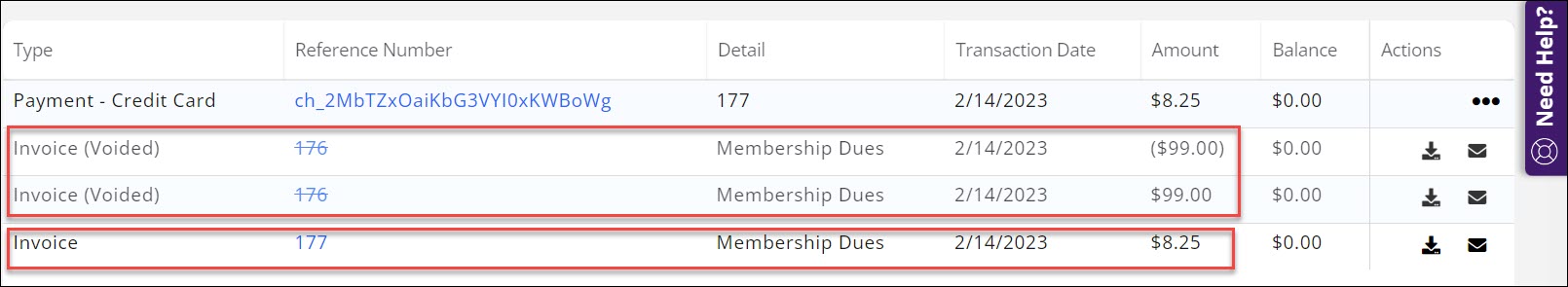 - An adjustment is added to the membership activity history with the new invoice attached.