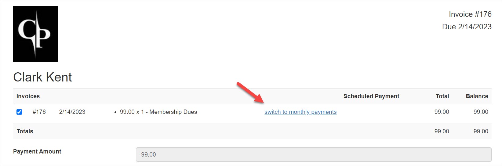 To reduce the burden of annual payments for your members, you have the ability to enable Allow Switching from Annual to Monthly Payments. When this option is enabled, your members will be presented with the option when using the payment link within emailed invoices.