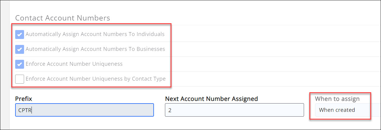 - Dependent on your When to Assign setting new contacts will be assigned an account number preceded by the prefix.