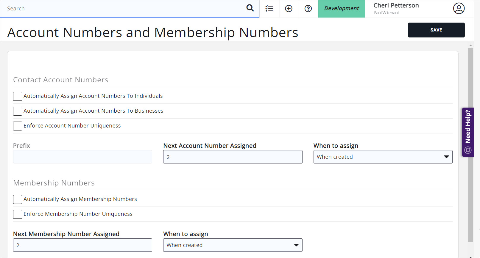 - When to assign: Select at what point you wish the account number to be assigned. When created will assign an account number to all contacts in the database, regardless of status. When approved will assign an account number when the membership status is active.
