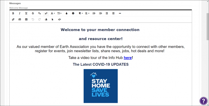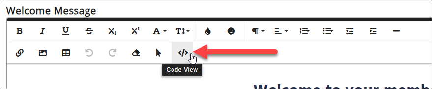 - Update the Welcome Message as needed. You may use the standard word processing tools (i.e. bold, italics, etc.) as well as add images and links, as well as the more advanced "Code View" option which allows you to paste HTML directly into the editor (such as embedding videos like the tour linked above).