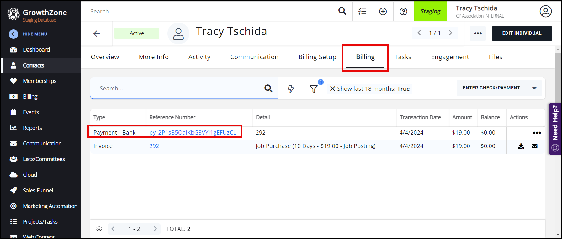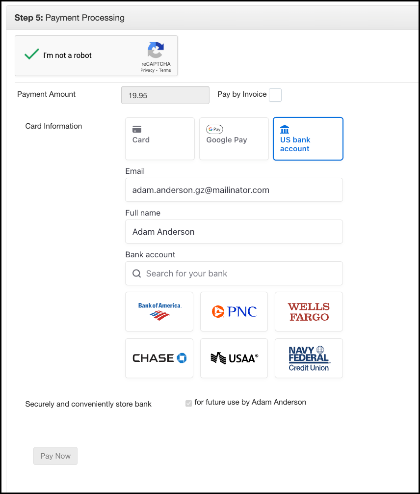 If Staff want to see ACH options example, it is recommended that they create a test contact record and create a test invoice to pay, then login into that record in an incognito window or browser they do not use to log into GZ. See Contact Records for Testing for more information. |