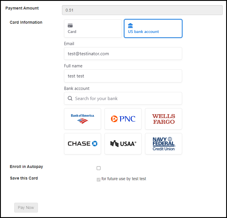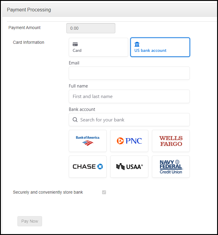 Customers will need to have an online banking platform already created with their bank. When choosing their bank from the drop-down, their online accounts will become available for their selection. The ACH payments are then recorded under a Contact's Billing tab as Payment - Bank. If the bank is not listed, the customer would need to pay with a credit card.