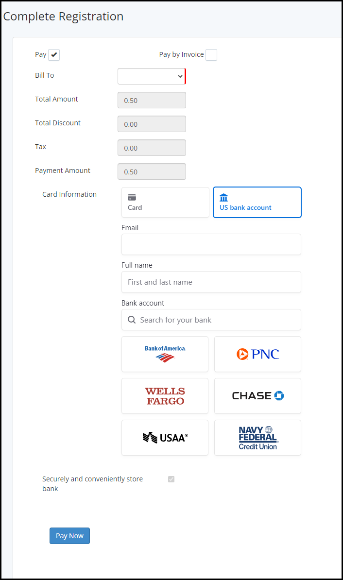 The event registration form allows customers the option to pay by ACH.
