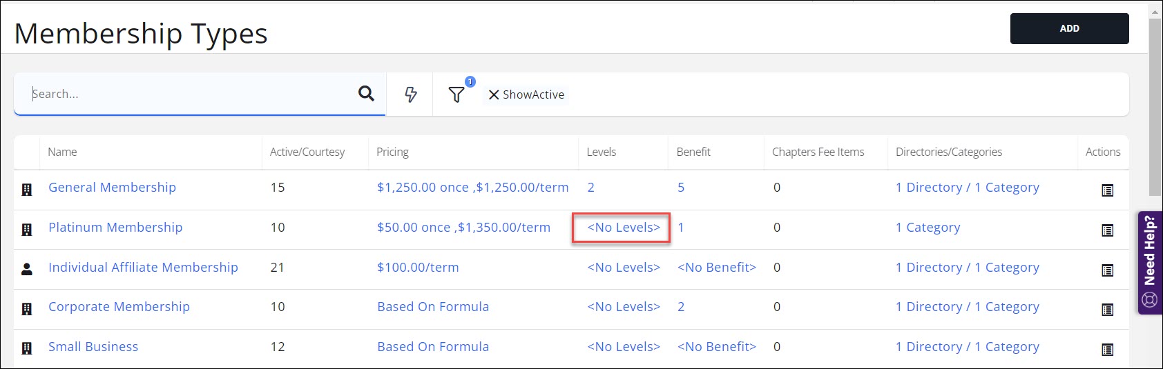 - In the Levels column, click the link in the row for the membership you wish to add levels to. NOTE: if levels have already been added to a membership type, click the numbered link in the Levels column.