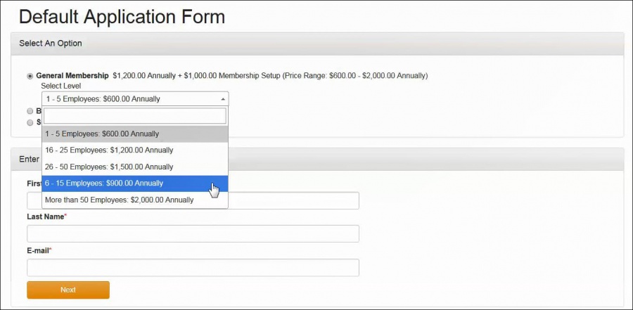 If you choose to include this membership type on your Membership Application form, applicants will be able to select the desired level from a drop-down list. The levels, their name and pricing will be displayed. NOTE: If you have enabled the Hide Pricing on Membership Selection option for your Membership Application form, pricing will not be displayed on the first page of the application. If enabled, pricing will only be displayed once a member reaches the payment page. See View/Create your Membership Application Form for further information.