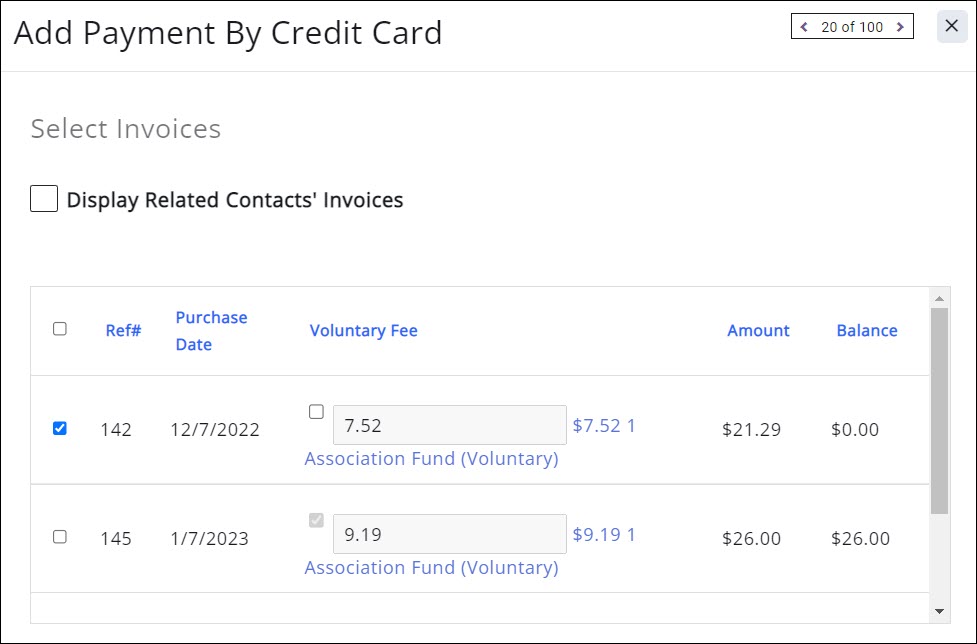 - All invoices associated to the contact will be displayed. Additionally, you can choose to show invoices for related contacts. Tick the checkbox for the invoice(s) you wish to pay.