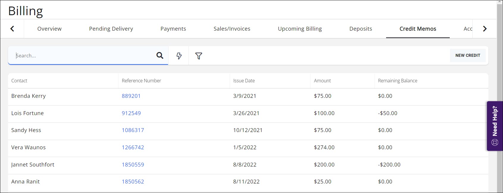 Credit memos can be viewed on a contact's Billing tab, or within the billing module. When viewed through the billing module, you will have the ability to filter the credit memos as needed. For example, you may wish to view all credit memos with an open balance.