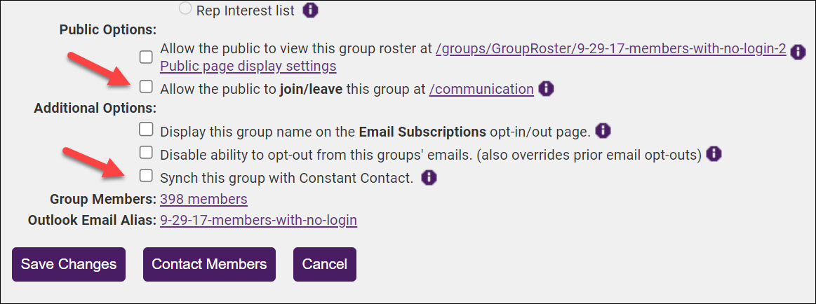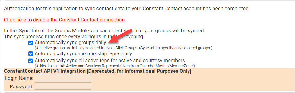 To sync to Constant Contact go to SETUP > ASSOCIATION OPTIONS > GENERAL OPTIONS & SETTINGS > ADD-ONS > CONSTANT CONTACT INTEGRATION SETUP > AUTOMATICALLY SYNC GROUPS DAILY.