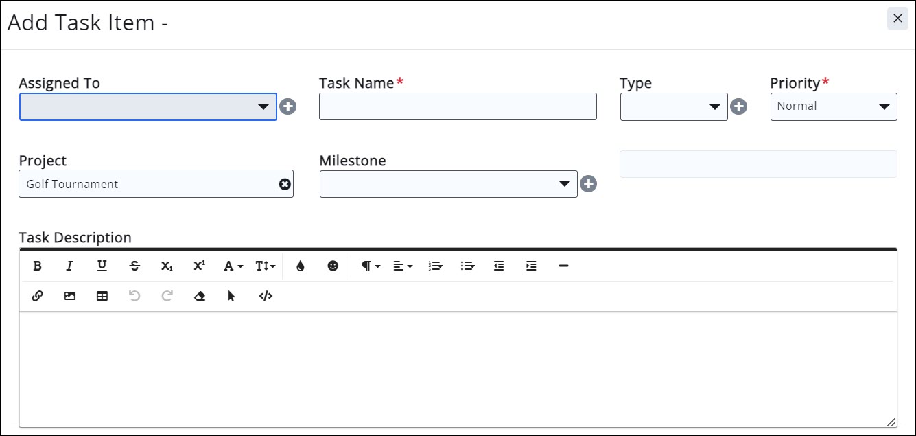 Task Type: Select a task type from the list. Task types are a way by which you will be able to report, search and filter tasks. If you wish to add a new task, click the