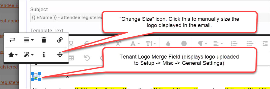 NOTE: When editing a template with the tenant logo URL merge field, sometimes the size of the logo will be modified. Be sure to set your desired logo size by clicking the logo, then selecting the "Change Size" icon and specifying the logo size. |