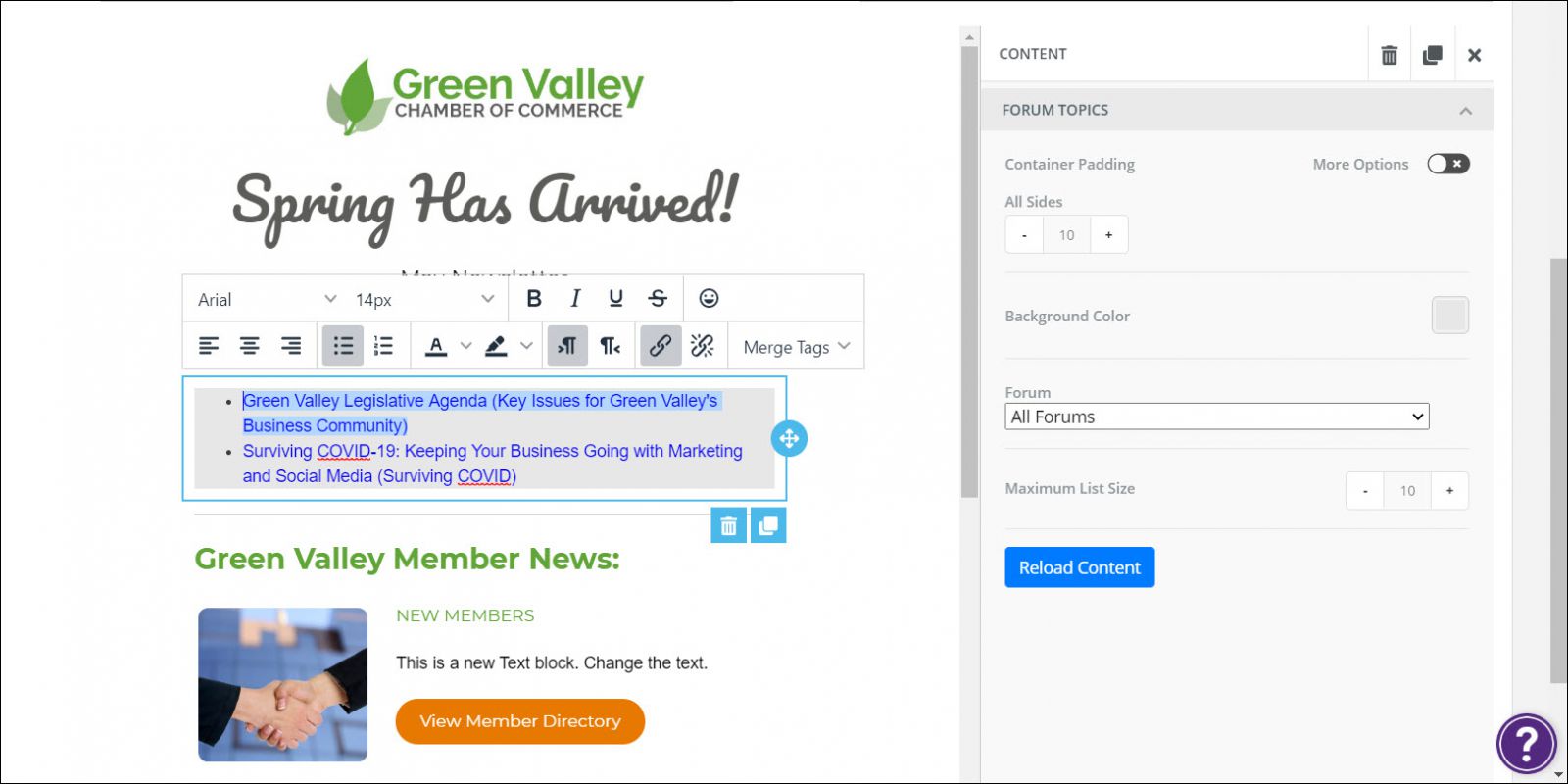 Drag and drop the Forum Topics block into your newsletter, and you will be able to: