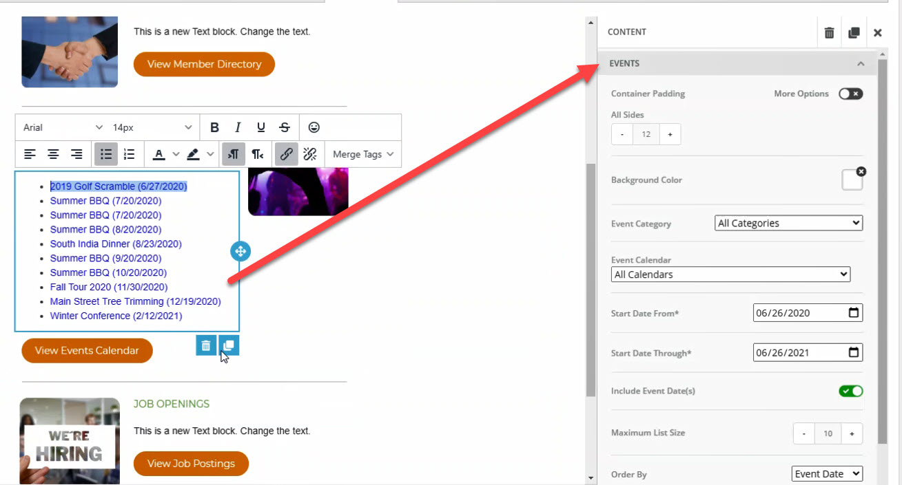 Once you have the list of new members loaded, you can click the list to refine any settings (adjusting dates, membership types, etc) or change formatting (font, color, bold, etc). You can also use the Merge Tags option to select additional fields to display in the list. See Email Designer Merge Tags for more information.