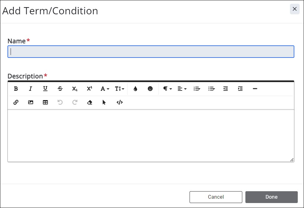- Enter a Name that easily identifies this terms & condition set. You may create multiple terms & conditions as needed by your business processes.