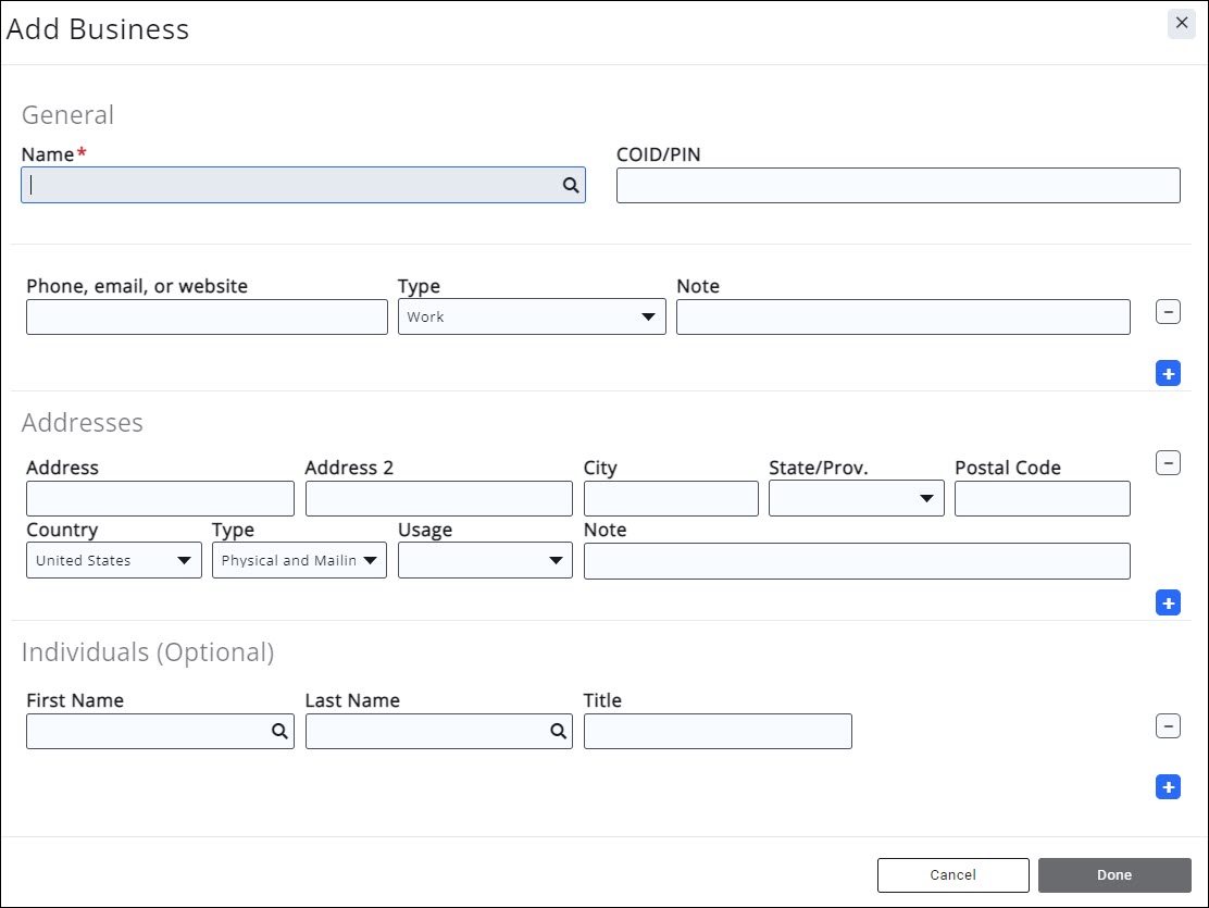 - Individuals (optional) - you may add individuals to associate to this organization. To add additional individuals, click the + button.