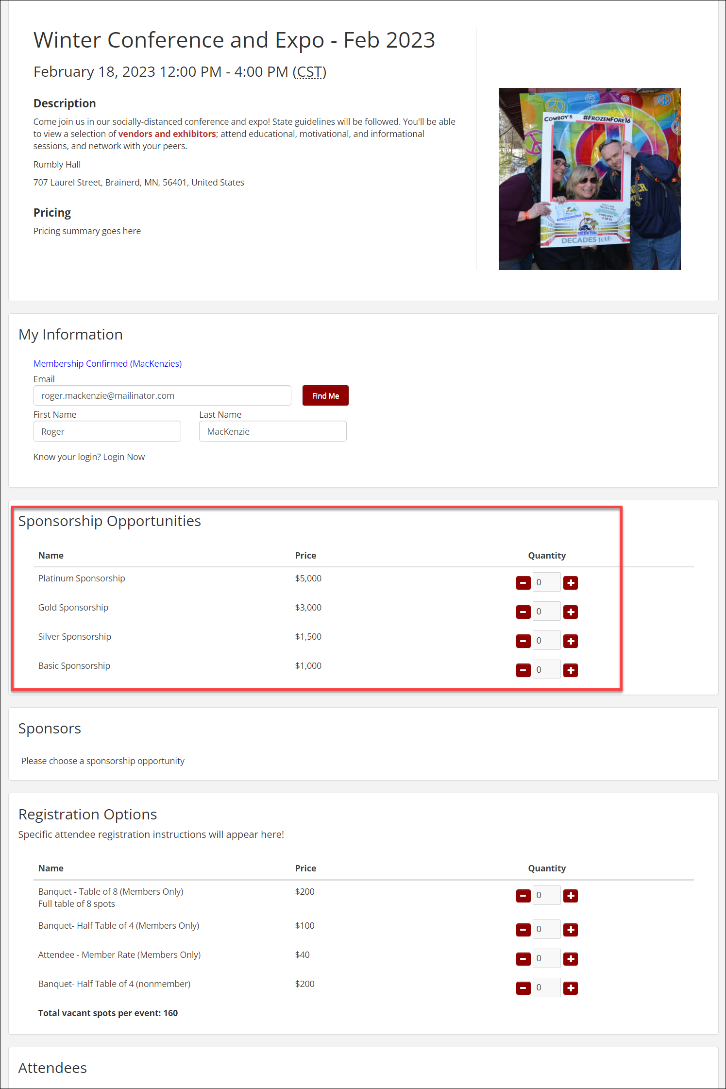 In this example, we have approved MacKenzies sponsorship that was submitted online; they still have a balance (they have not paid for the sponsorship), but because staff approved them their name is now displaying on the event page, the registration page, and in any emails related to the event. (The sponsorship level they purchased only displays their name, not their logo or URL.)
