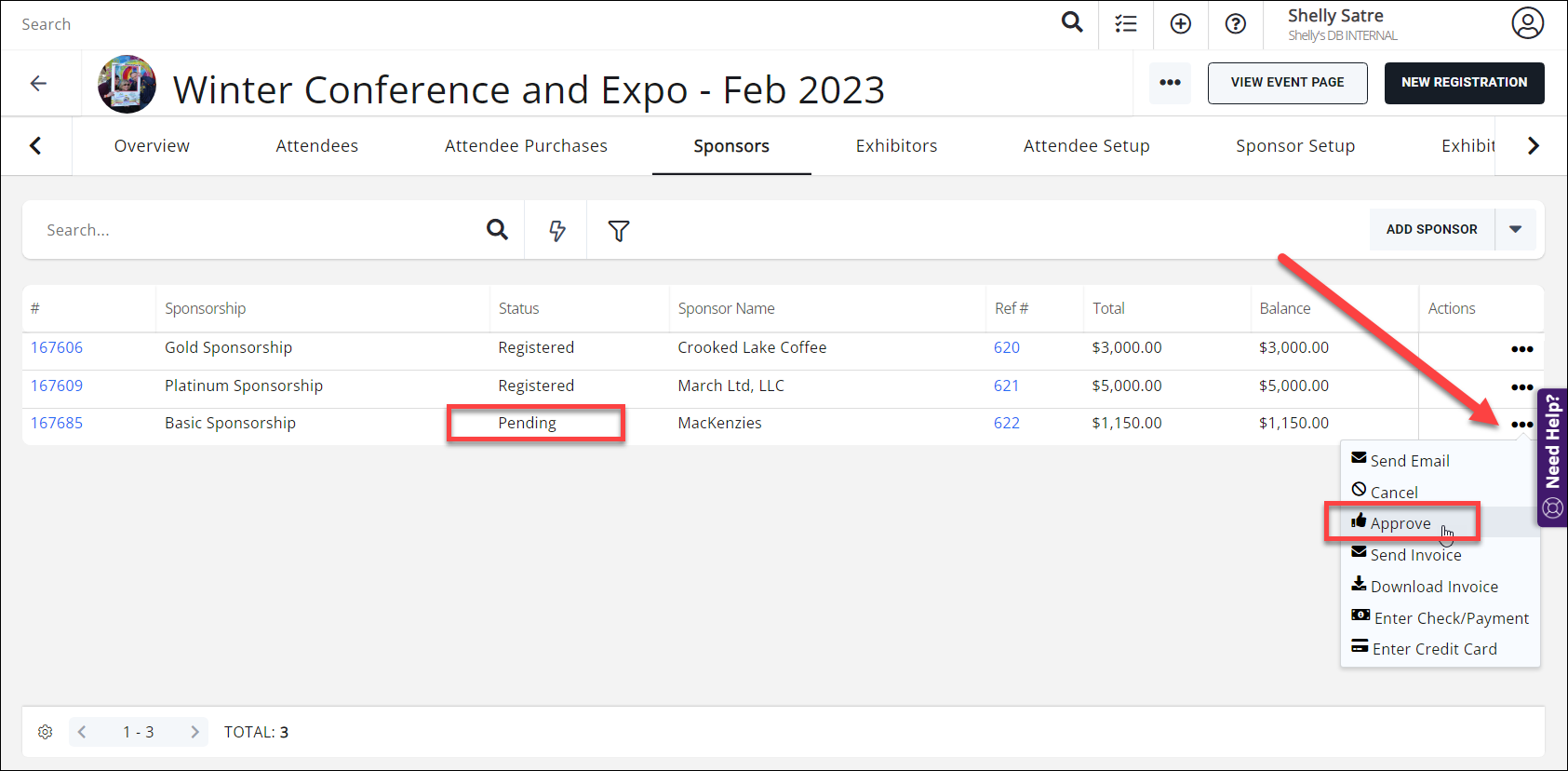 IMPORTANT: Any sponsorships that arrive via the event registration page will have a "Pending" status. Be sure to use the Actions menu and Approve sponsorships after they have been reviewed by staff! |