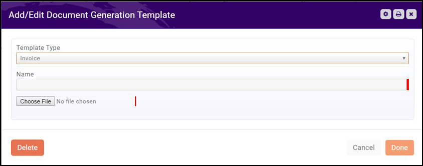- Select the Template Type. This setting will define where the template is available to you in the software. For example, document templates of type Invoice will only be available where billing functions are performed.