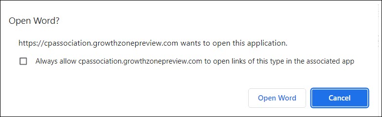 - Click Open Word. You will be taken to the document editor login. Enter your GrowthZone username and password to launch the document.